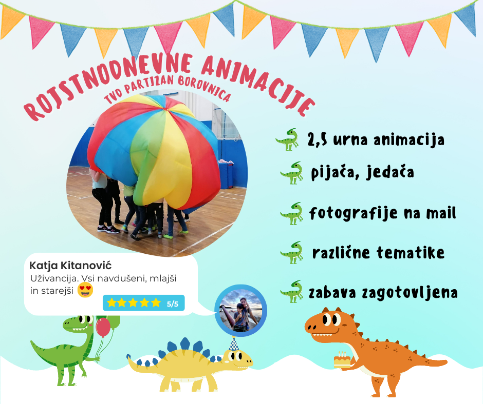 Pri nas vam nudimo praznovanje rojstnega dneva v zgornji ali spodnji telovadnici TVD Partizan, pridemo pa tudi na vašo lokacijo.